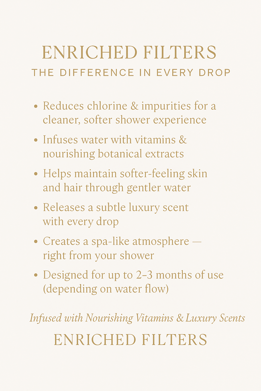 Carefully formulated in Korea with skin-compatible ingredients like Vitamin C, Coconut Oil, and Collagen - our filters gently purify your water by reducing chlorine, rust, and other impurities. From the first drop, your hair feels softer, your skin calmer, and the air around you fills with elegant scent.