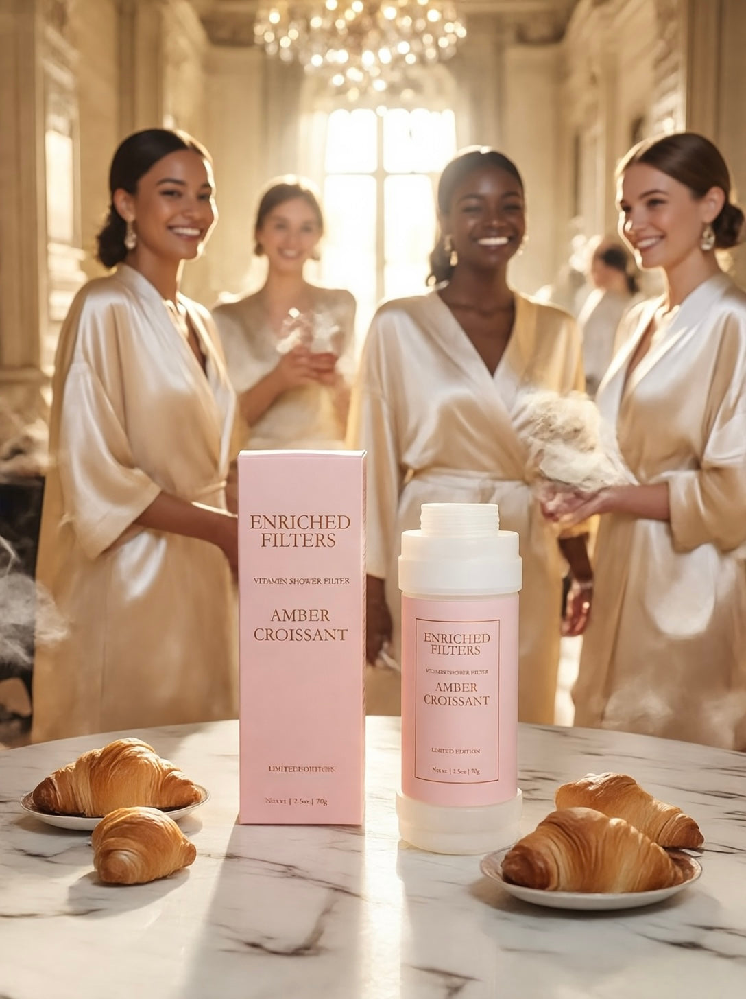 Amber Croissant features an amber-inspired aroma with gentle berry sweetness, smooth soft woods, and a subtle hint of warm, pastry-like coziness — creating a feminine and elegant scented experience. The aroma feels sweet, warm, and comforting, like a soft “croissant moment” wrapped in amber warmth. A dreamy, indulgent experience every time the water runs.